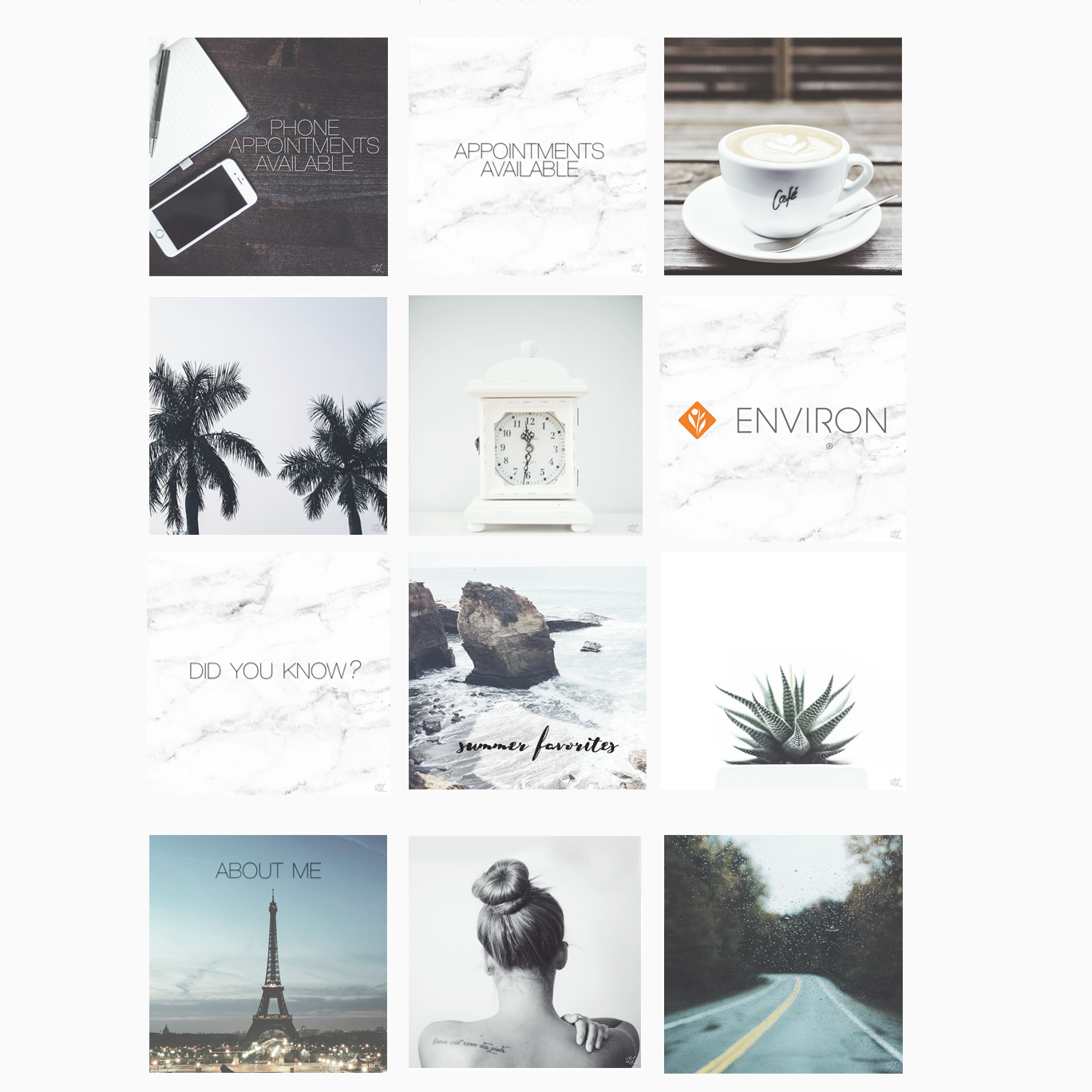 An Instagram template to give a local aesthetics business a cohesive look. Created in Photoshop in August 2017, with public domain stock images.